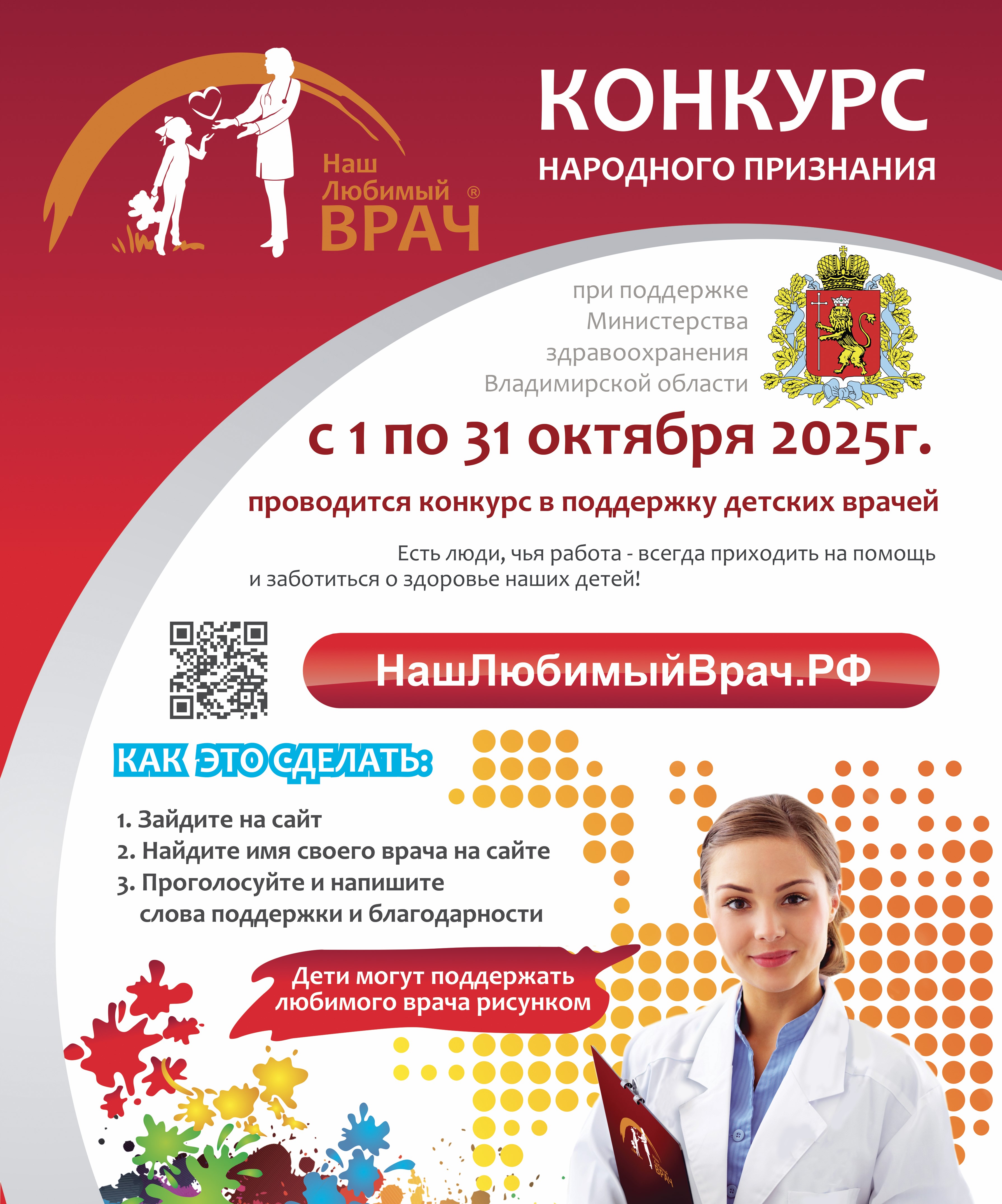 Сроки проведения - с 1 по 31 октября 2025 г.Друзья, мы очень рады, что общими усилиями нам удалось сделать Конкурс «Наш Любимый ВРАЧ» традиционным и ожидаемым событием во многих регионах нашей страны, в рамках которого тысячи докторов различных специальностей слышат в свой адрес тёплое слово «Спасибо!», дающее силы сохранять и беречь здоровье детей!